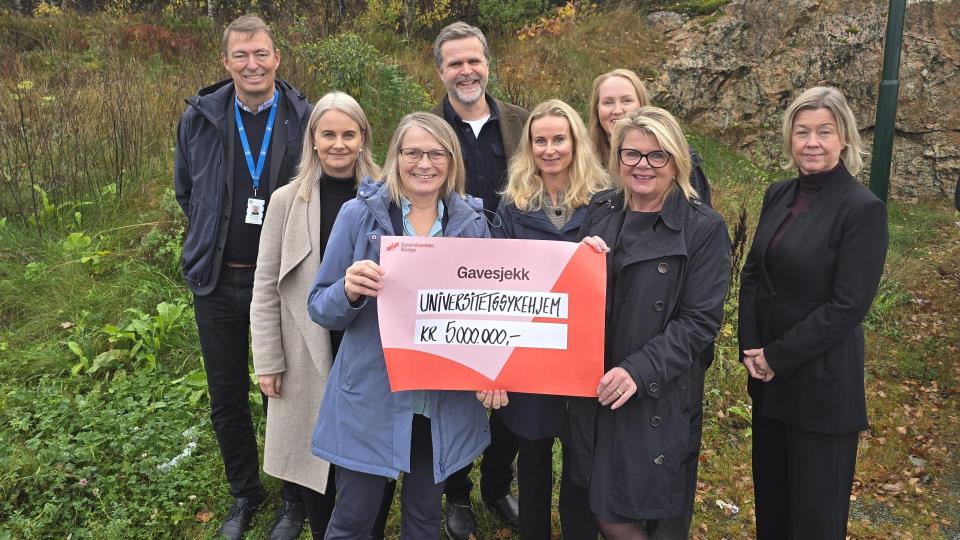 Pengegave til Universitetssykehjemmet Sparebanken Norge gir fem millioner kroner til Universitetssykehjemmet i Grimstad gjennom Sør-fondet. Publisert 22.10.2025 kl. 15.27