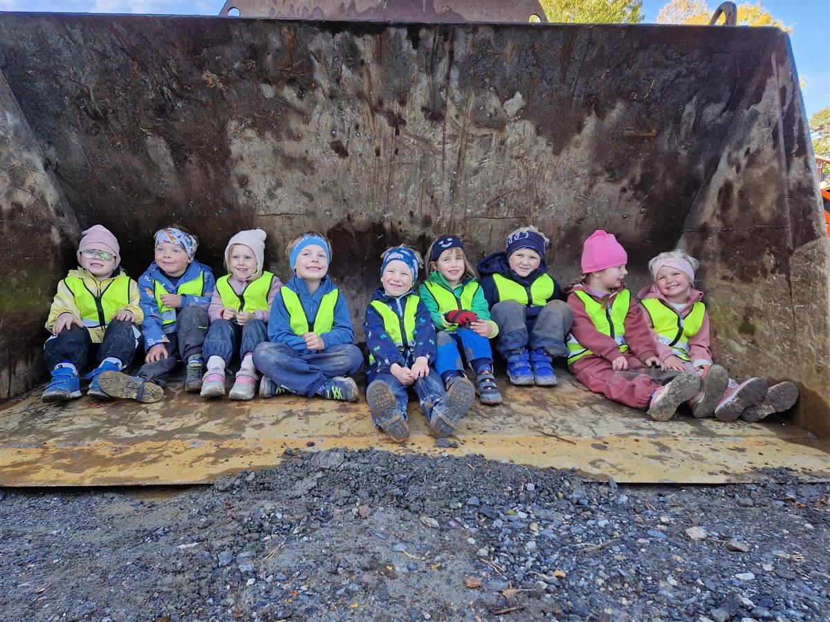Barna fra Eide barnehage syns det var skikkelig kult å sitte inne i gravemaskin-skuffa.