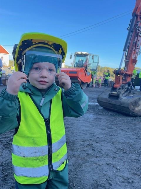 Eirik Landås (3) fikk prøve en av arbeidernes hjelmer. Det var stas.Det var entreprenøren Heldal, Agder fylkeskommune og Grimstad kommune som inviterte til det lille arrangementet ved Jortveit bedehus.