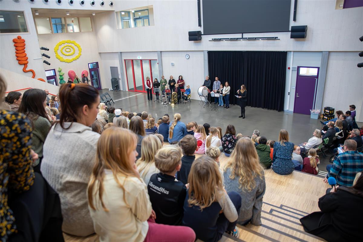 Elever, ansatte og gjester samlet seg i skolens allrom under åpningsmarkeringen, med musikkinnslag og program fra scenen.