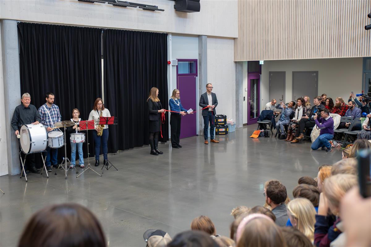 Offisiell åpning i skolens allrom. Snoren klippes mens elever, ansatte og inviterte gjester følger seremonien, med musikalsk innslag i bakgrunnen.