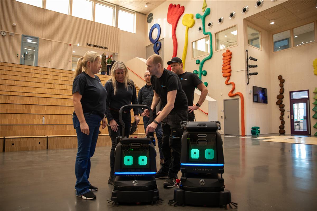 Renholdere får opplæring i bruk av de nye vaskerobotene før de tas i ordinær drift på Fjære barneskole.