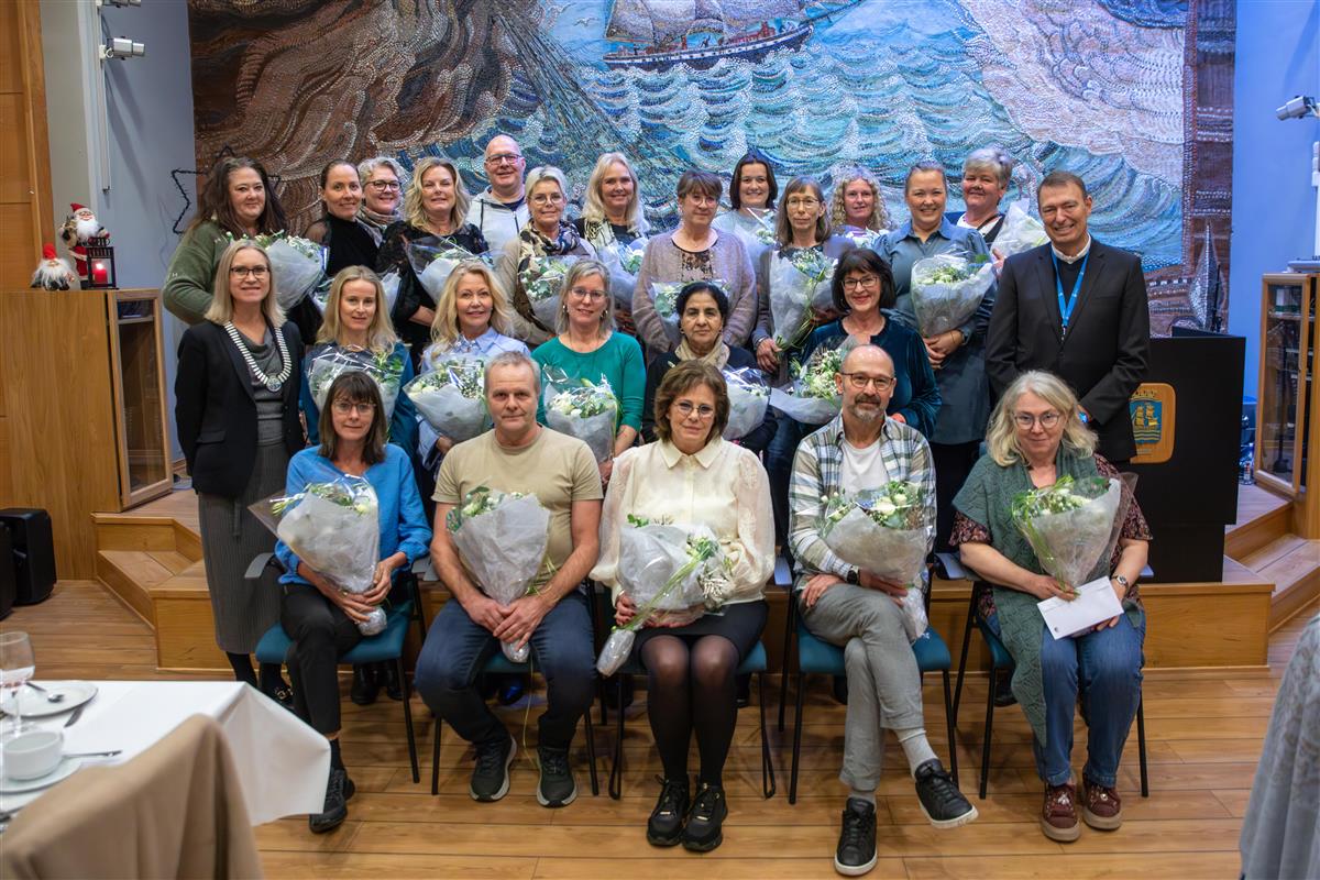 Årets 25- og 40-årsjubilanter ble markert onsdag 10. desember, og mottok blomster som takk for mange års innsats i Grimstad kommune. Både ordfører og kommunedirektør var til stede under markeringen.