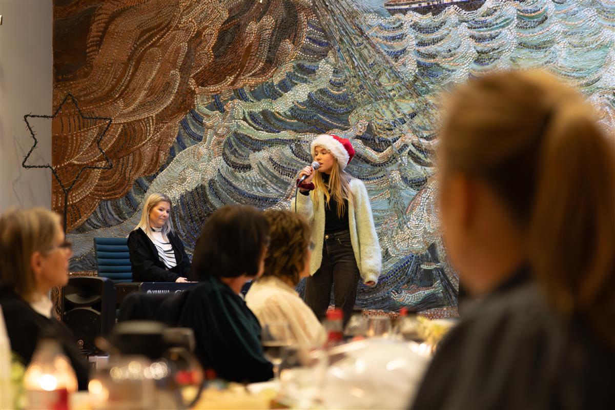 En elev fra Grimstad kulturskole bidro med sang under jubileumsmarkeringen, til stor glede for de fremmøtte.