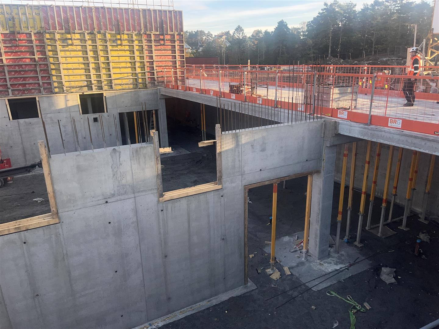 – Nå er første etasje ferdig, eller «dekke over første», som vi sier. Når kjelleren er på plass, har vi nådd en viktig milepæl. Nå er det full produksjon av betong, og vi er i gang med søylene og bjelkene til andre etasje. Vi håper å ha det nye etasjedekket på plass om cirka fire uker. Om en måneds tid starter vi også med tømrerarbeid på ytterveggene. Deretter begynner vi å lukke veggene i første etasje, og målet er å få gjort mest mulig før vinteren setter inn, forteller prosjektleder Robin Simonstad i BRG, som står for byggingen av skolen.