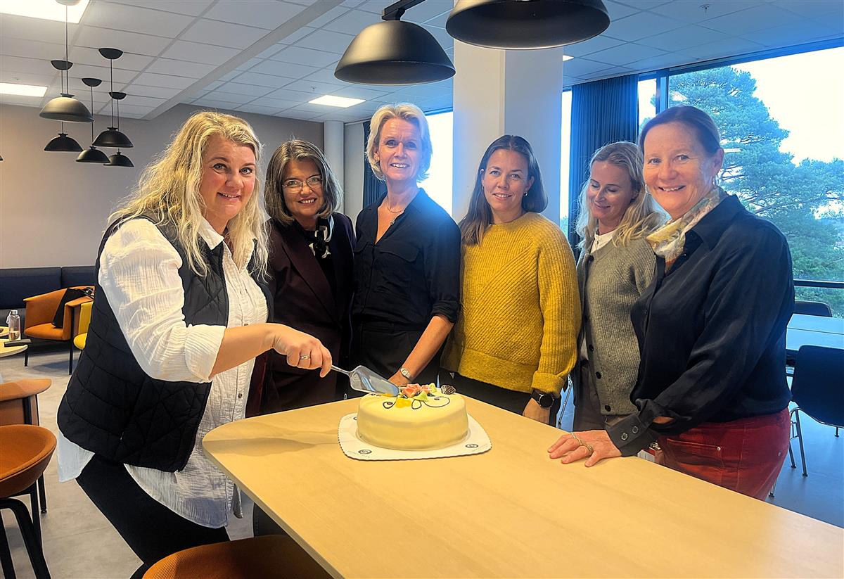 Denne gjengen feiret at søkanden var sendt inn med kakefest. F.v. Kathrine Melby Holmerud (Prosjektleder Grimstad kommune), Mariann Fossum (Professor ved Institutt for helse- og sykepleievitenskap, UiA), Lene Baagøe Laukvik (Forsker på Senter for e-helse, UiA), Elisabeth Giil (Jobber i administrasjonen på Senter for e-helse, UiA), Silje Bjerkås (Prosjektleder Universitetssykehjemmet i Agder), Ragni Macquenn Leifson (Administrativ leder på Senter for e-helse, UiA).Grimstad kommune fikk 240.000 kroner til et forprosjekt i Pilot Helse-programmet 2024, og nå er søknaden til hovedprosjektet sendt inn. 17,5 millioner kroner ligger i potten. At søknaden nå er sendt, ble nylig markert med kake sammen med en av våre samarbeidspartnere på UiA. Prosjektet som er søkt midler til skal være med på å bidra til å forme fremtidens helsetjenester. Ny teknologi skal frigjøre tid for helsepersonell, slik at de kan bruke mer tid på pasientene og de oppgavene som krever helsefaglig kompetanse.
