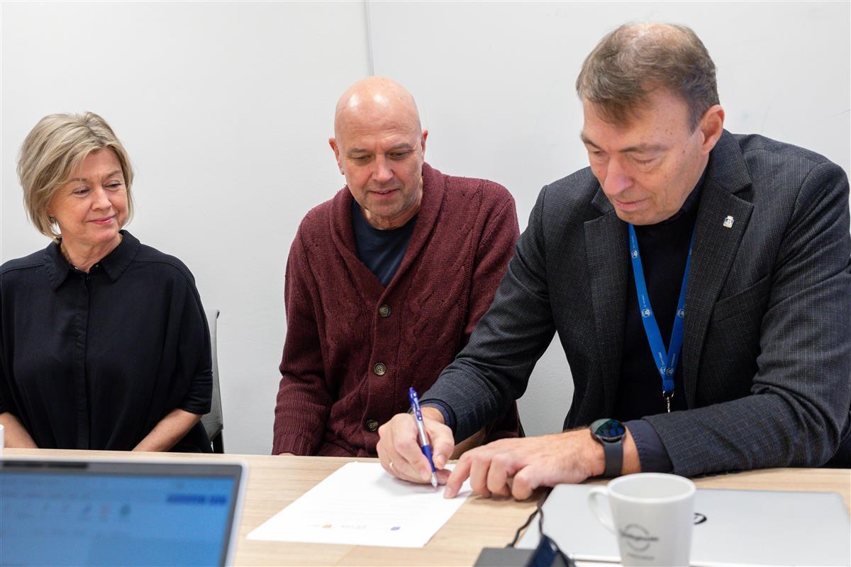 Kommunedirektør Magnus Mathisen signerte onsdag 12. november samarbeidsavtalen mellom Grimstad kommune, Universitetet i Agder og Fagskolen i Agder om utviklingen av Universitetssykehjemmet i Agder.